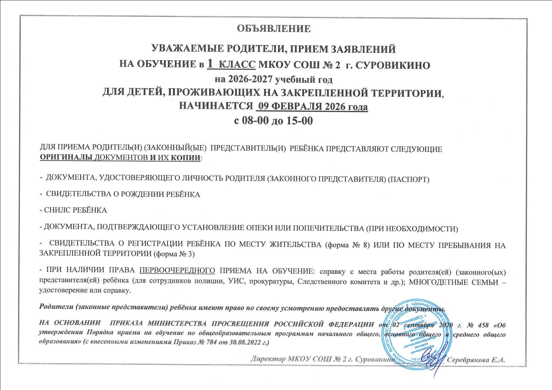 Приказ об организации набора обучающихся в 1 класс МКОУ СОШ №2 г.Суровикино на 2026-2027 учебный год